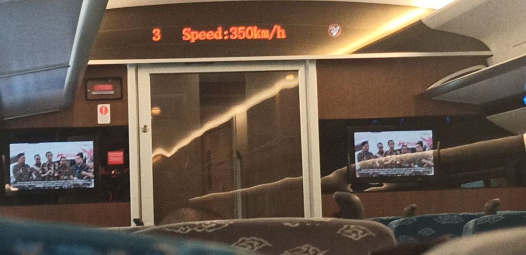 Akhirnya aku bertemu si Whoosh. Setelah itu, kami masuk ke gerbong tempat kami duduk. Dan tidak lama, kereta berangkat. Saat kereta bergerak, aku mulai memperhatikan running text yang menyampaikan informasi kecepatan Whoosh. Mashaallah, kali ini aku benar-benar berada di kereta dengan kecepatan yang sangat tinggi di negaraku Indonesia, 350km/jam.