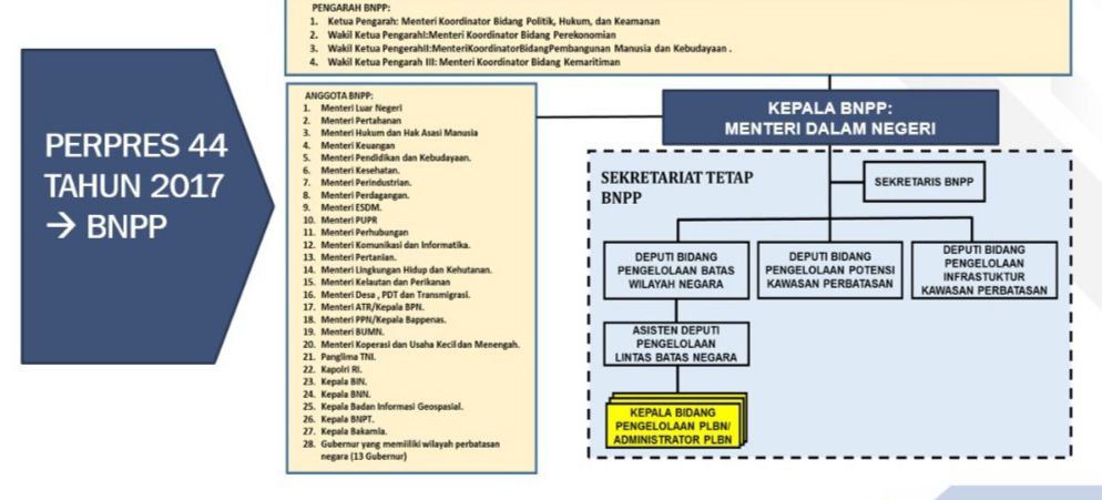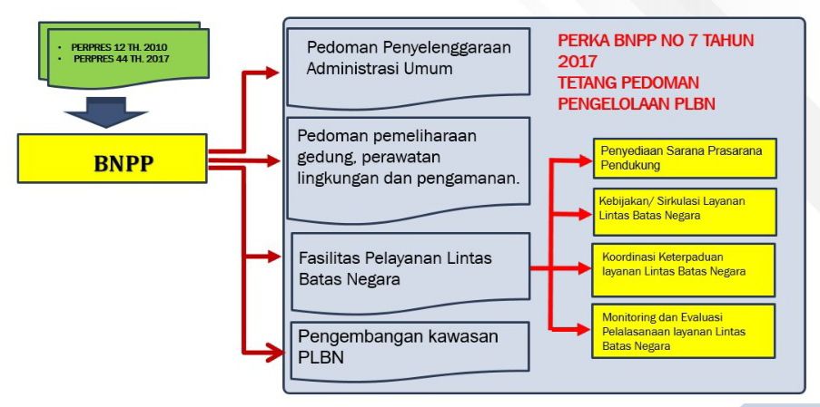 Kemudian BNPP menetapkan Perka BNPP No 7 Tahun 2017 tentang pedoman pengelolaan PLBN yang berisi penyediaan sarana prasarana pendukung, kebijakan/sirkulasi layanan lintas batas negara, koordinasi keterpaduan layanan lintas batas negara, serta monitoring dan evaluasi pelaksanaan layanan lintas batasnegara. Semua dilakukan untuk memberikan kemudahan kepada para pelintas sebagai pedoman.