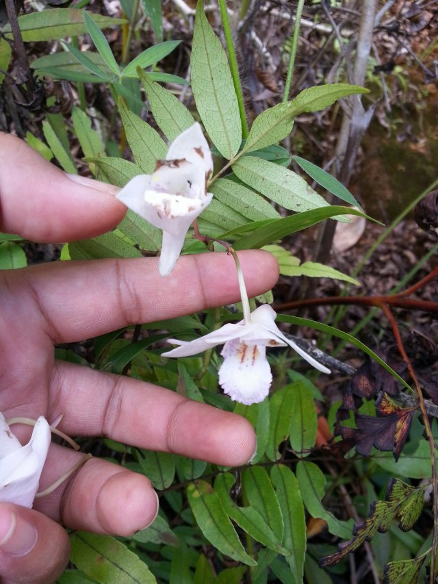 Yang satu ini disebut Arundina Graminifolia dengan bunga didominasi warna putih. Bibir bunganya unik membentuk corong dengan tepian ungu melebar keluar. Dan didalamnya berbercak kuning dan kecoklatan membentuk garis ke pangkal bibir.