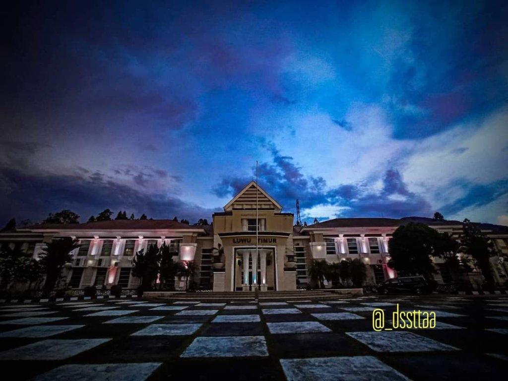Perpaduan langit biru dan awan putih menambah artistik gambaran kokoh Kantor Bupati Luwu Timur. Bangunan megah dengan sayap kanan dan kiri laksana seekor burung yang sedang terbang mengitari Bumi Batar Guru. Tampah begitu gagah di moment pergantian terang menuju gelap malam. Saat semua makhluk mulai terpekur menyeru panggilanNya, mengistirahatkan diri dari lelah aktivitas seharian.