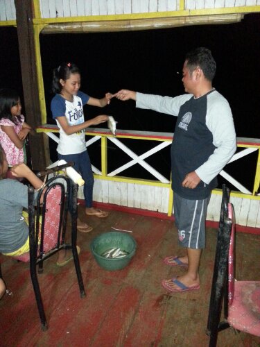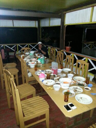 21.00 Di tengah perjalanan, rombongan singgah makan malam di warung Aroma Laut Lampia, Malili. Hidangan seafood pun disajikan dan sempat-sempatnya kak Budi ikut memancing usai makan malam.