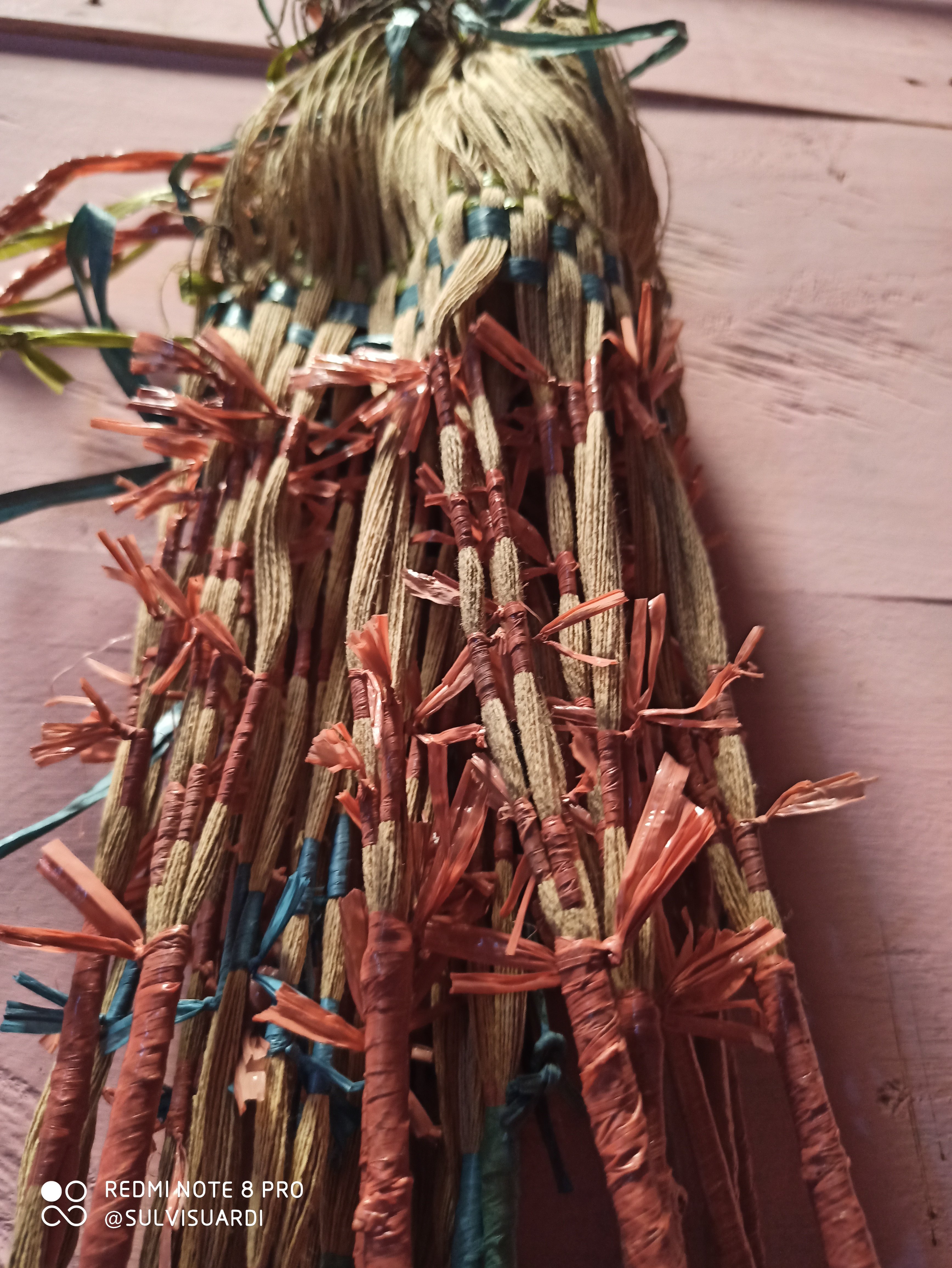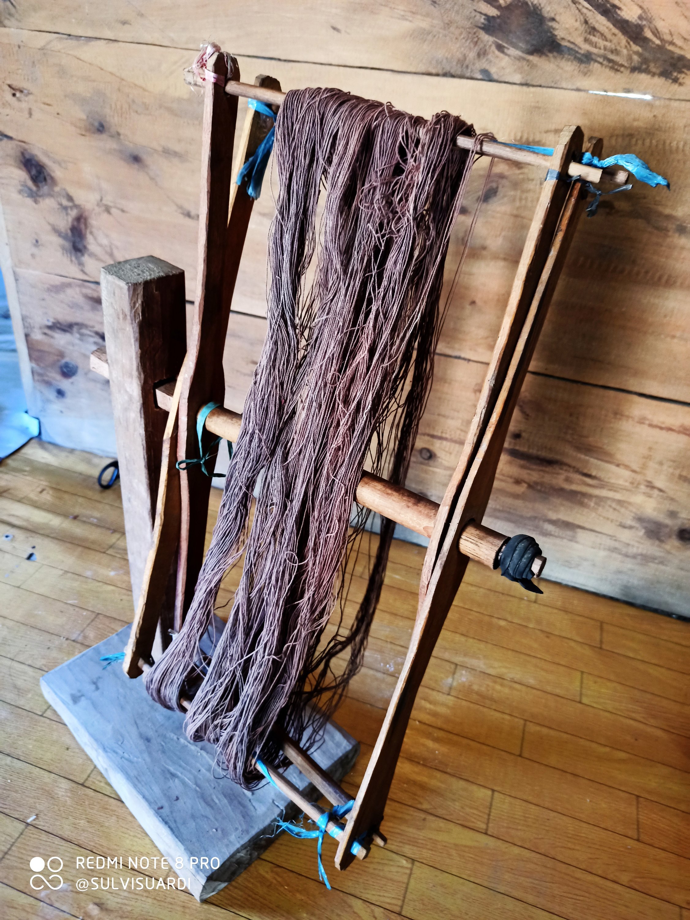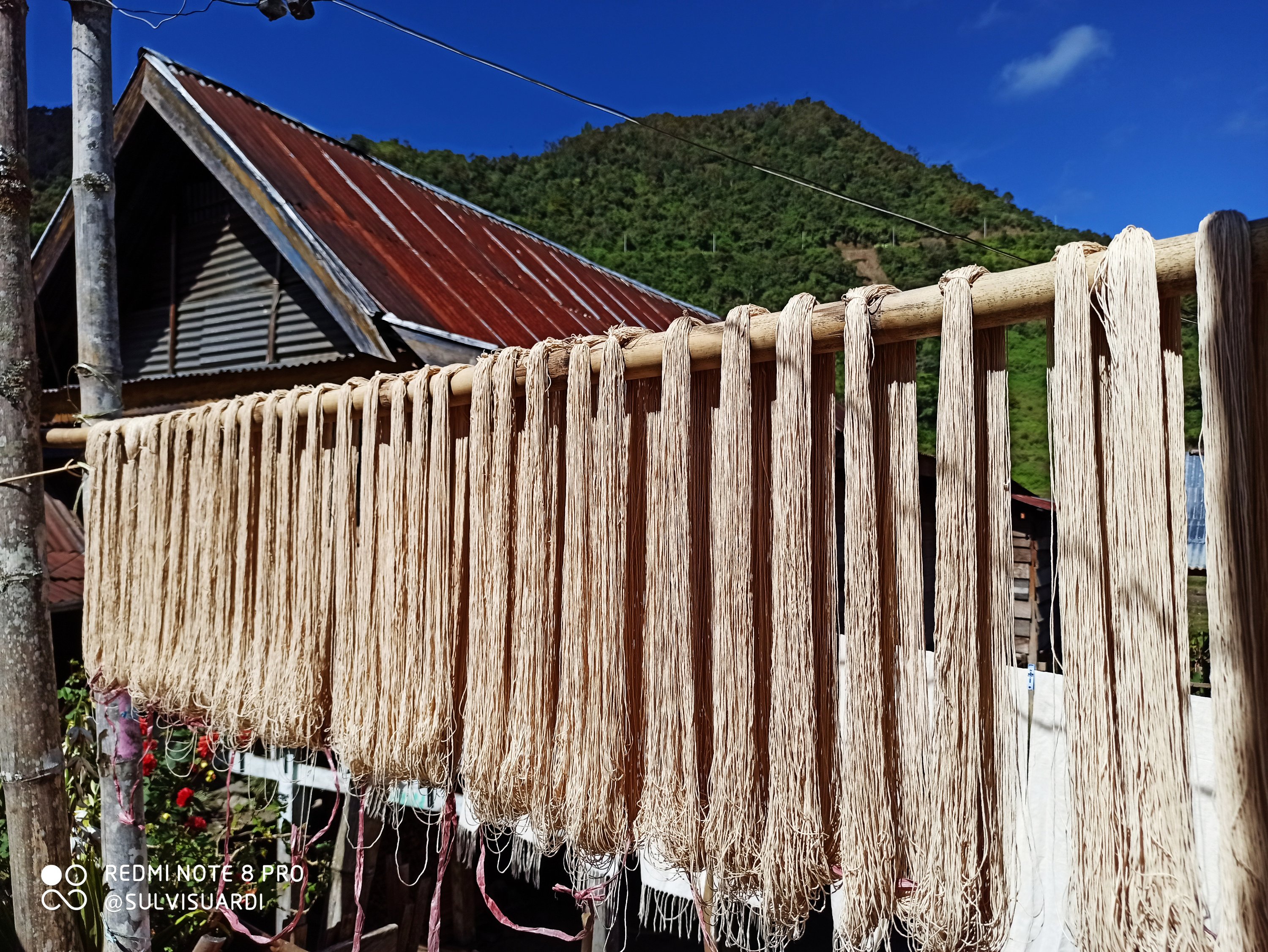 Benang yang sudah ditumbuk lalu dijemur supaya warna melengket karena pewarnaan alam dari tumbuh-tumbuhan