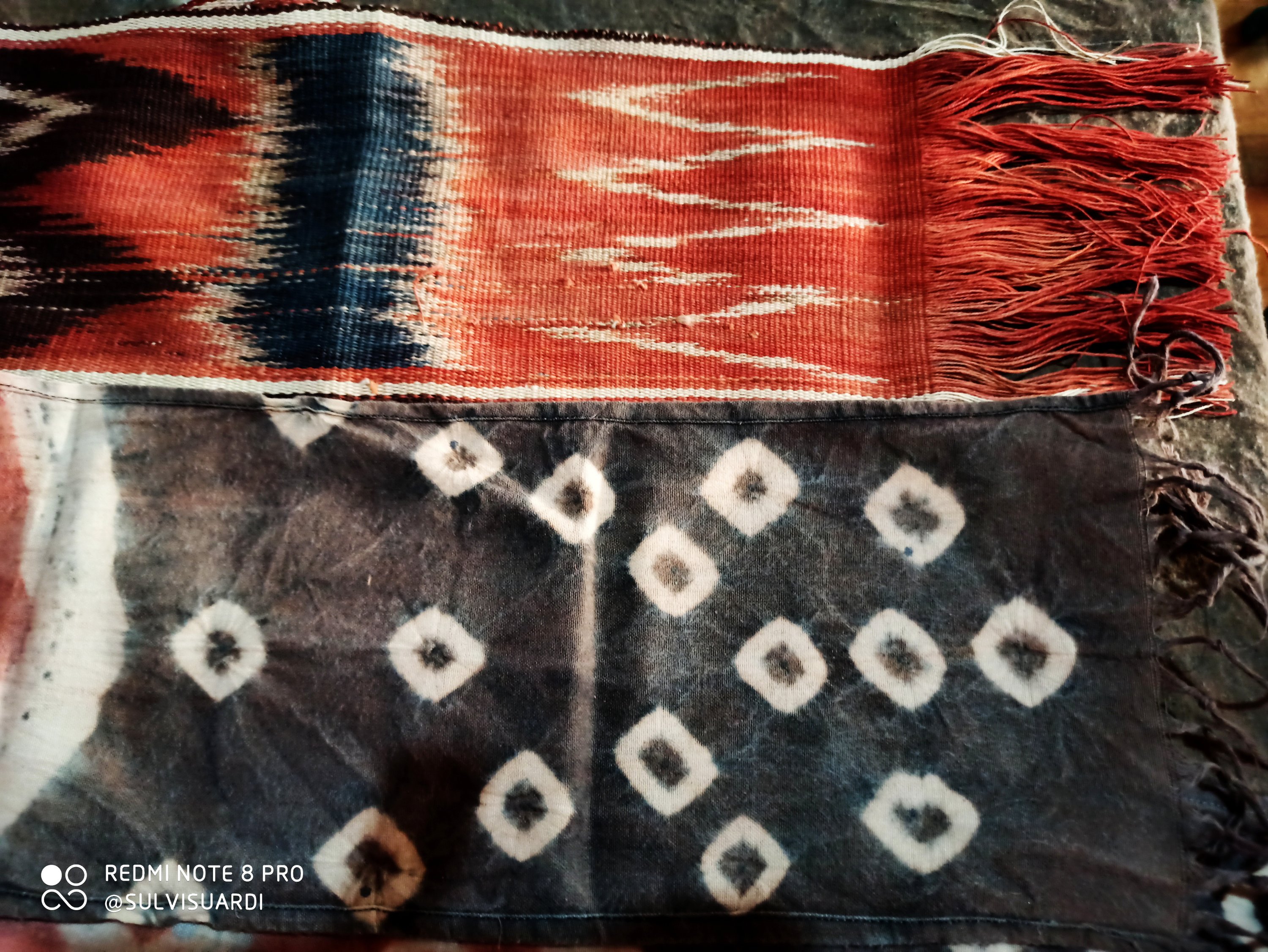 Kedua; benang dan kain yang sudah disimpan 1 minggu, diikat. Lalu dicelup ke dalam cairan warna. Untuk warna hitam dari daun kayu, kalau merah dari akar kayu