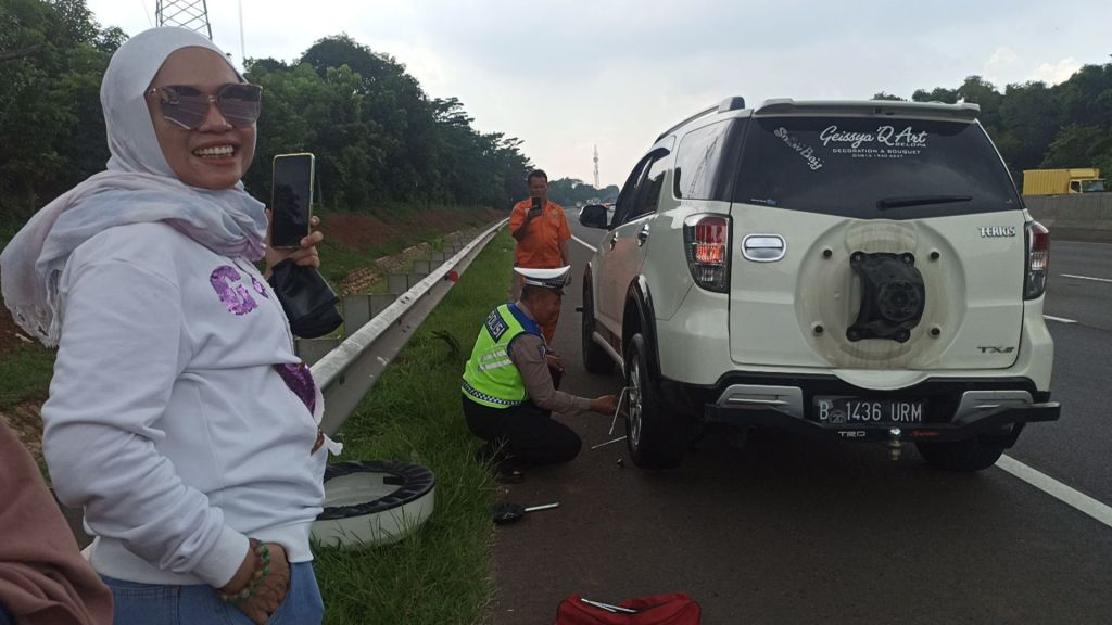 Menikmati perjalanan di Tol Km. 63 Jakarta-Cikampek, tiba-tiba mobil merapat ke sisi jalan. Rupanya ban belakang sebelah kiri kempes. Apesnya lagi, ban serep juga kempes.