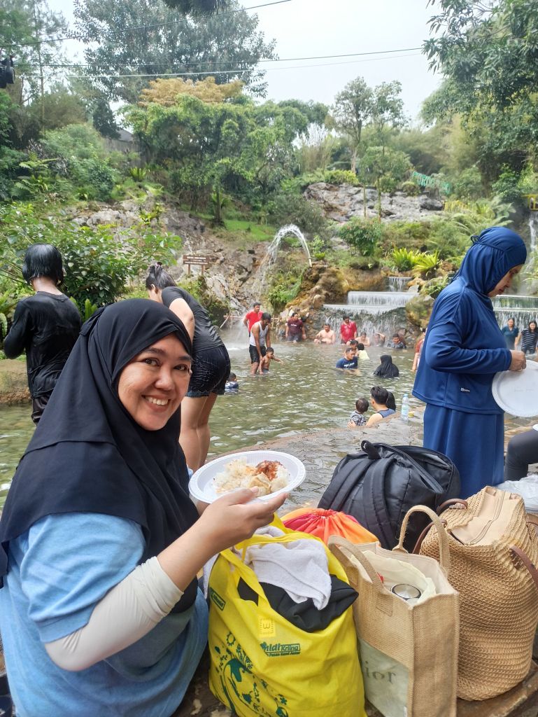 Sebelum menikmati aliran air panas Ciater, idak lupa kami menikmati santap siang di tepi kolam yang sudah disiapkan Gery Andi Picunang, puteri Opu Odeng. Hawa panas yang terasa membuat kami segera menyelesaikan santap siang dengan menu nasi, ikan, telur dan mie goreng yang sedap.