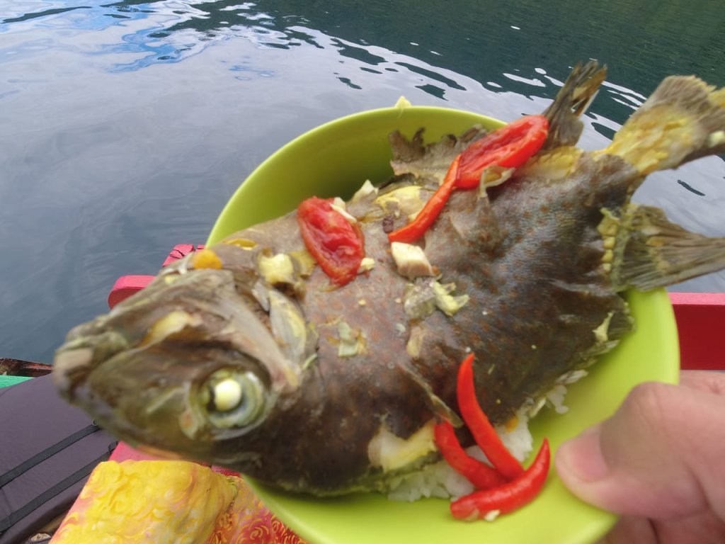 Rasanya baru sebentar kami berenang, sudah dipanggil makan. Sebelum tiba di rumah apung ini, kami sempat menyambangi pak Bambang yang sedang memanen ikan di “Bila” nya. Bila adalah sebutan tempat menangkap ikan dari kayu dan jaring yang ramah lingkungan. Kami diberikan beberapa ekor ikan segar.