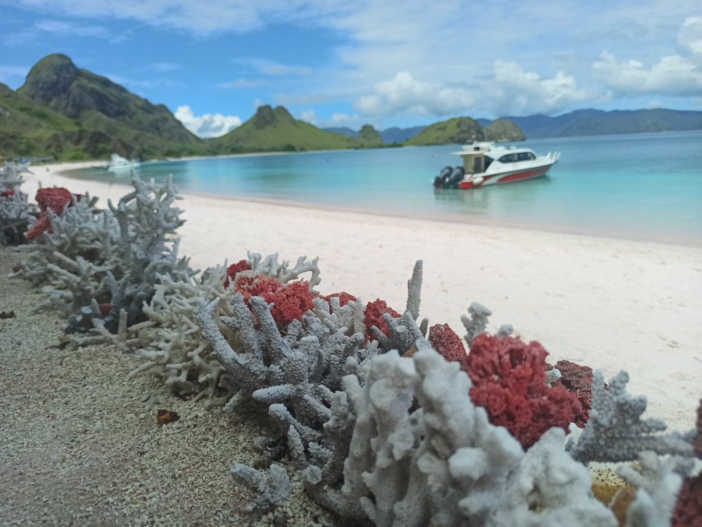 Selanjutnya perjalanan ke pantai Pink. Menurut beberapa sumber, warna pink pantainya berasal dari hewan yang berukuran mikroskopis bernama Foramifera. Hewan inilah yang memberikan pigmen merah pada koral. Koral-koral tersebut kemudian terbawa gelombang menuju pasir lalu hancur menjadi pasir pantai.
