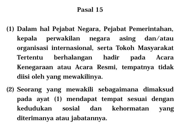 Jadi, kalau seorang pejabat diwakili, maka yang mewakilinya tetap mendapatkan tempat duduk sesuai kedudukannya, bukan sesuai jabatan yang diwakilinya. Meskipun beliau hadir dan memberikan kata sambutan. Untuk itu pemilihan orang yang mewakili sebaiknya minimal setingkat dengan tuan rumah.